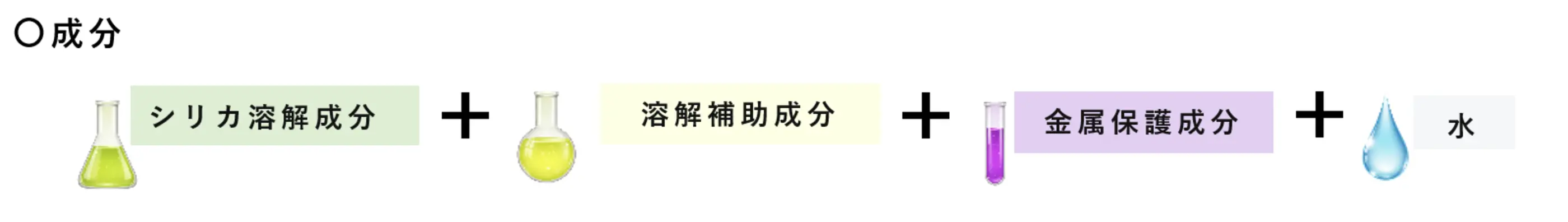 - シリカ溶解成分と 溶解補助成分を独自のフォーミュラー技術で配合することにより、強力な洗浄を実現