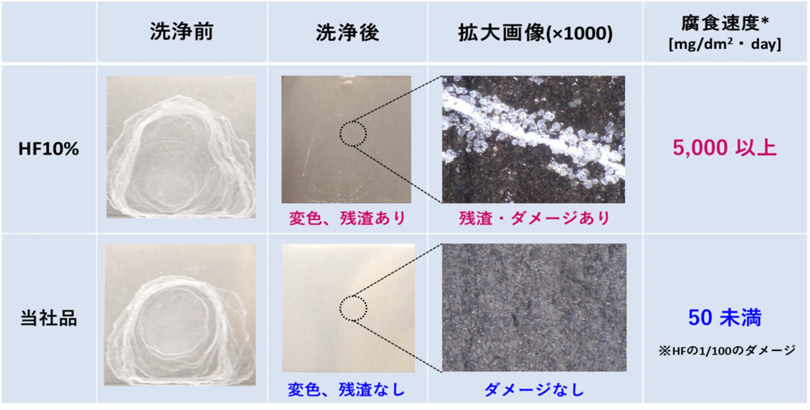 静置のみでも十分な洗浄力が確認され、またダメージもフッ酸の1/100と低ダメージなことが確認されました。