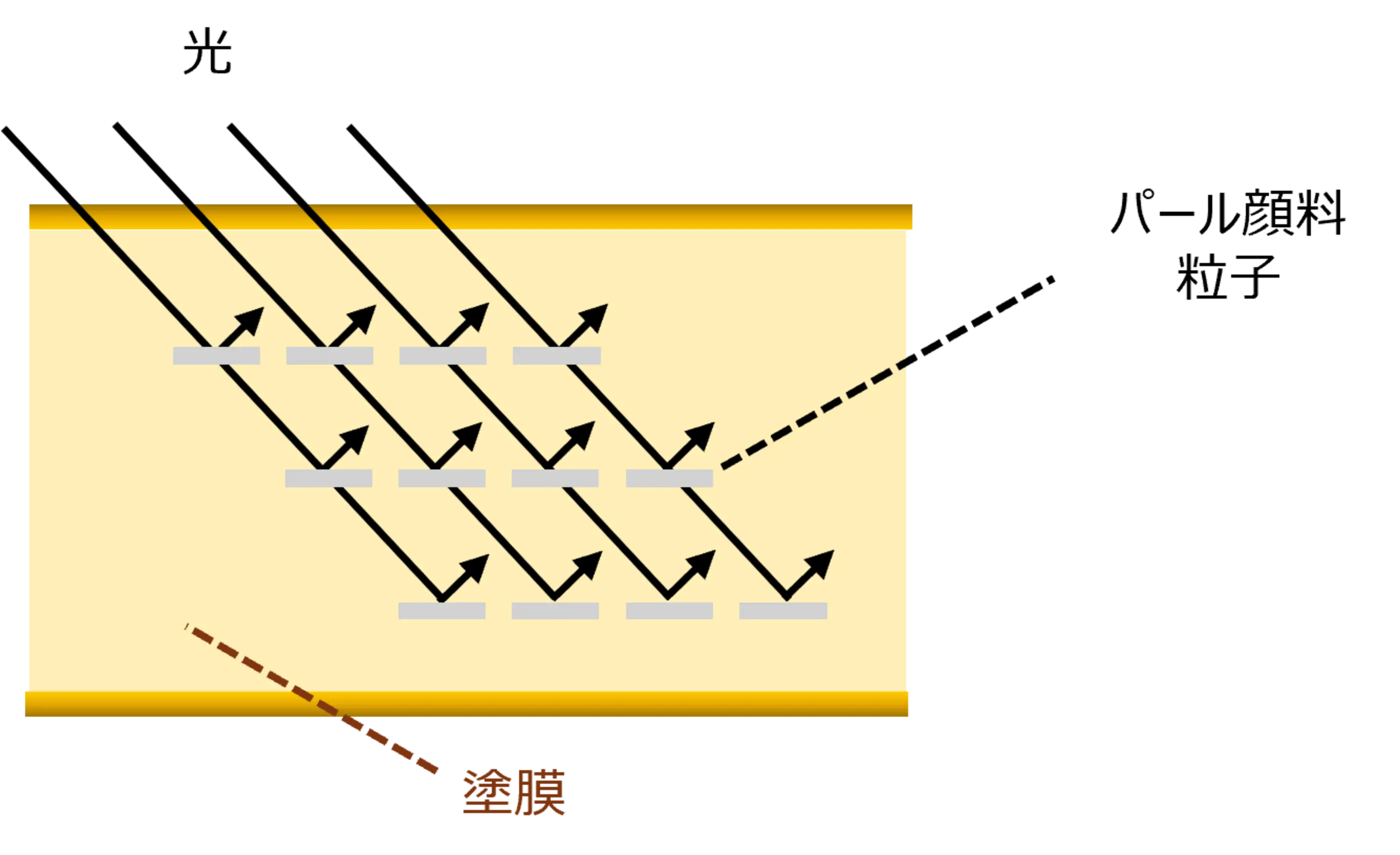 この多層構造に光が入射することで、多重反射と薄膜干渉が生じ、真珠のような柔らかな光沢(パール光沢)や干渉色が発現します。