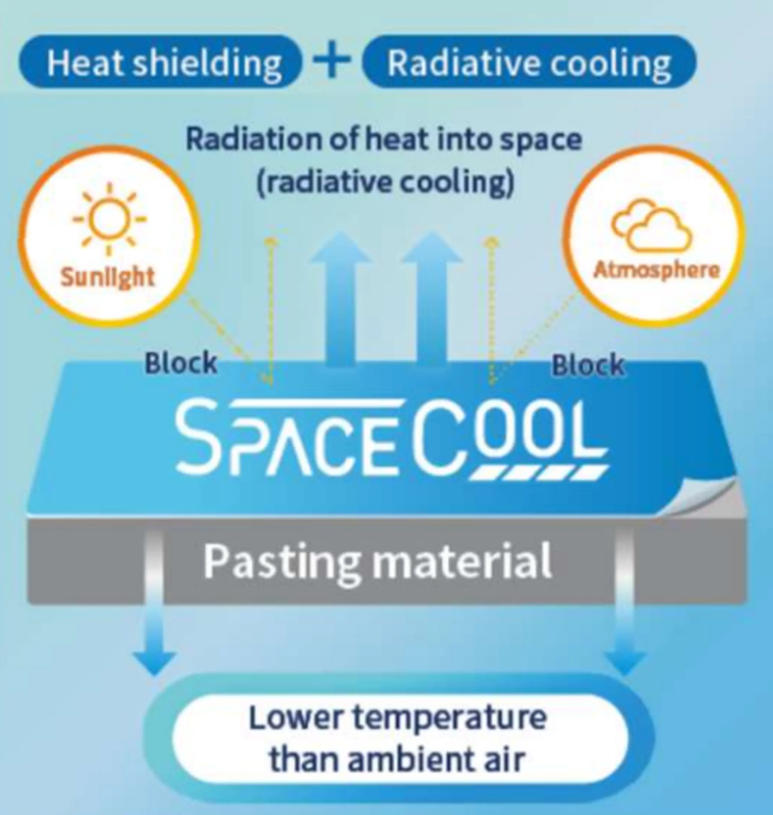 SPACECOOL can reduce surface temperatures by 2–6°C below ambient under direct summer sunlight. Its radiative cooling capacity is 120–150 W/m², depending on weather conditions and internal heat load.